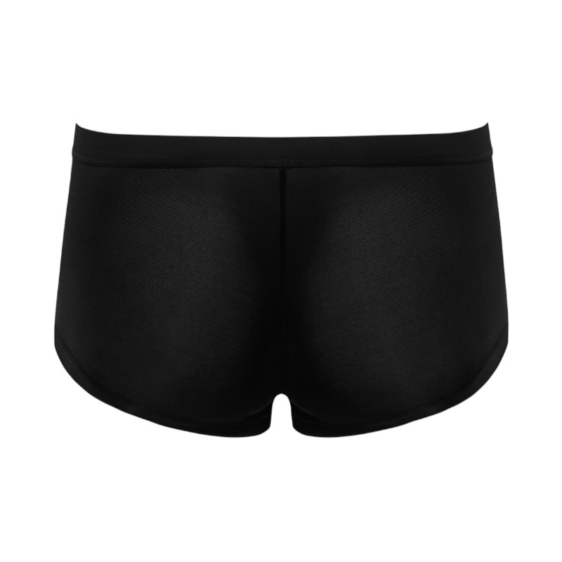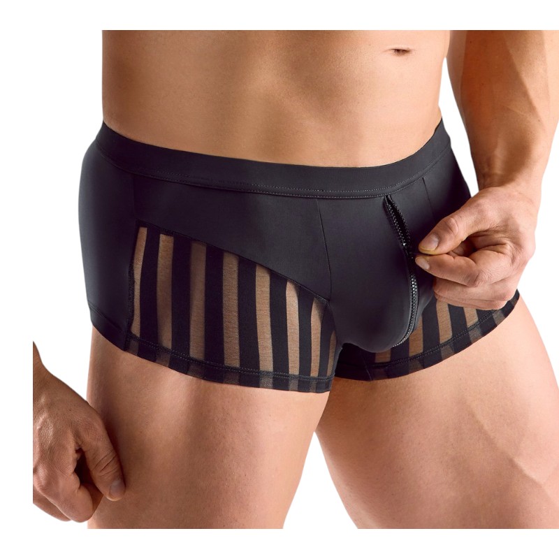 Zmysłowe bokserki męskie wykonane z miękkiej czarnej mikrofibry, z transparentnymi wstawkami po bokach i z przodu, które dodają erotycznego charakteru. Posiadają praktyczny zamek z wyściełanym przodem, podkreślającym sylwetkę i zapewniającym wygodę. Elastyczny materiał gwarantuje doskonałe dopasowanie i komfort noszenia.