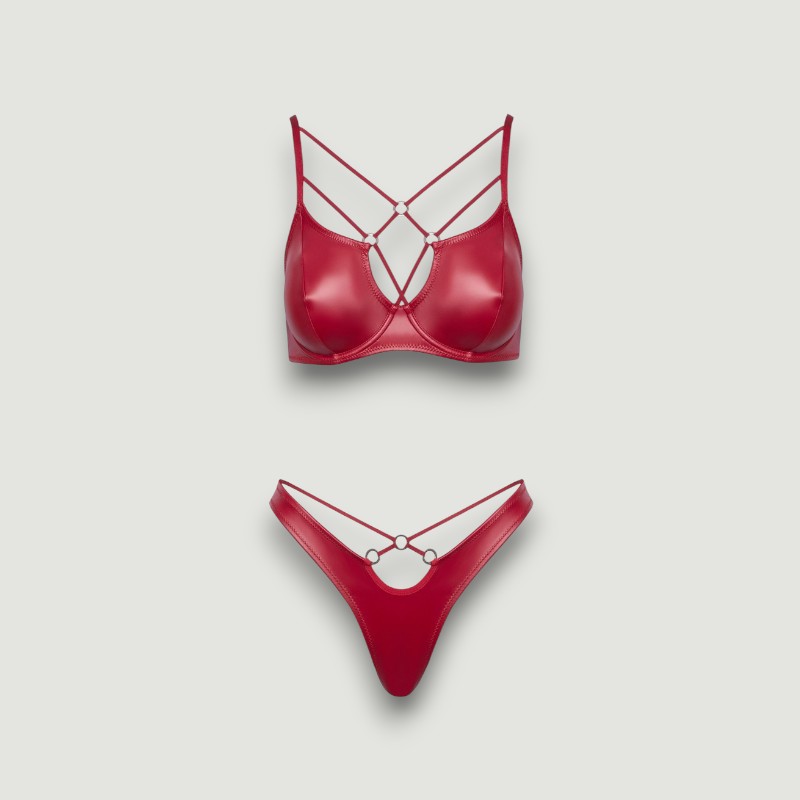 Wyjątkowy zestaw bielizny, który łączy zmysłowy wygląd z wyrafinowaną elegancją. Biustonosz na fiszbinach i stringi wykonane z czerwonego materiału w stylu wet look zachwycają swoim drapieżnym charakterem. Miękki i elastyczny materiał zapewnia maksymalny komfort noszenia.