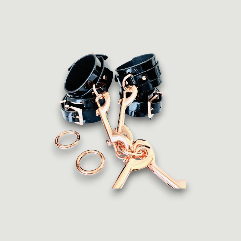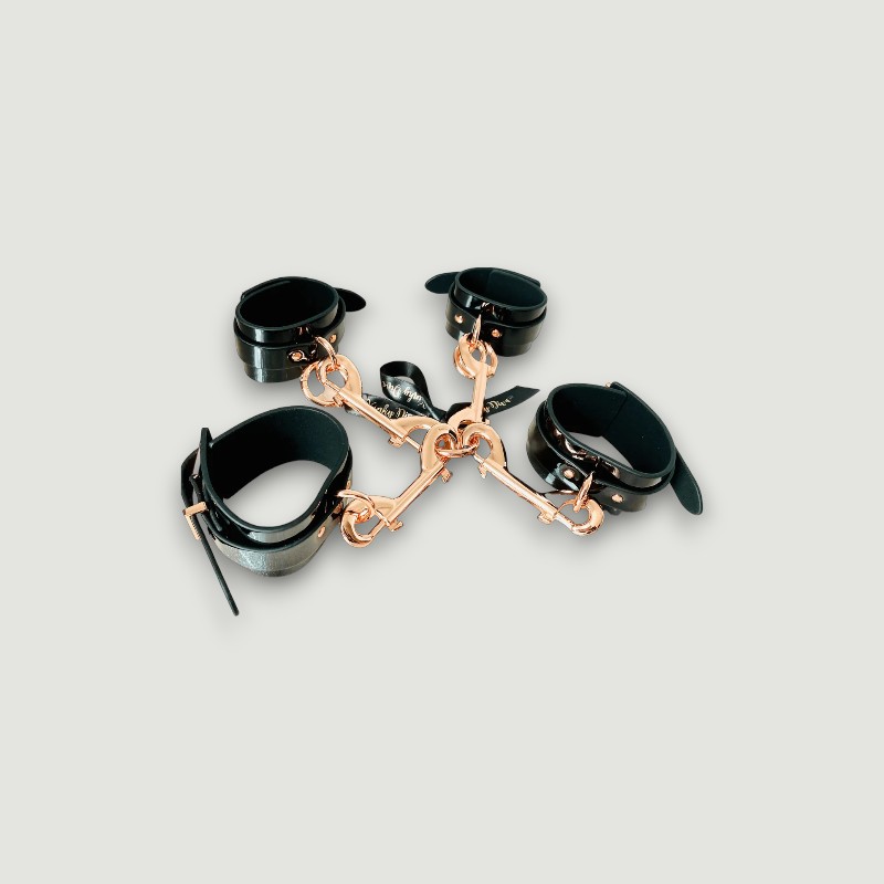 Luksusowy zestaw składający się z wysokiej jakości kajdanek na ręce i nogi oraz hogtie, idealny dla osób poszukujących ograniczonej swobody ruchów. Kajdanki wykonane z pięknego, błyszczącego, wegańskiego skóropodobnego materiału, zapewniają komfort nawet podczas długiego noszenia. Cztery solidne klamry w stylu „hogtie” oraz dodatkowe okrągłe klipsy umożliwiają różnorodne kombinacje, pozwalając na jeszcze bardziej intensywne doświadczenia.