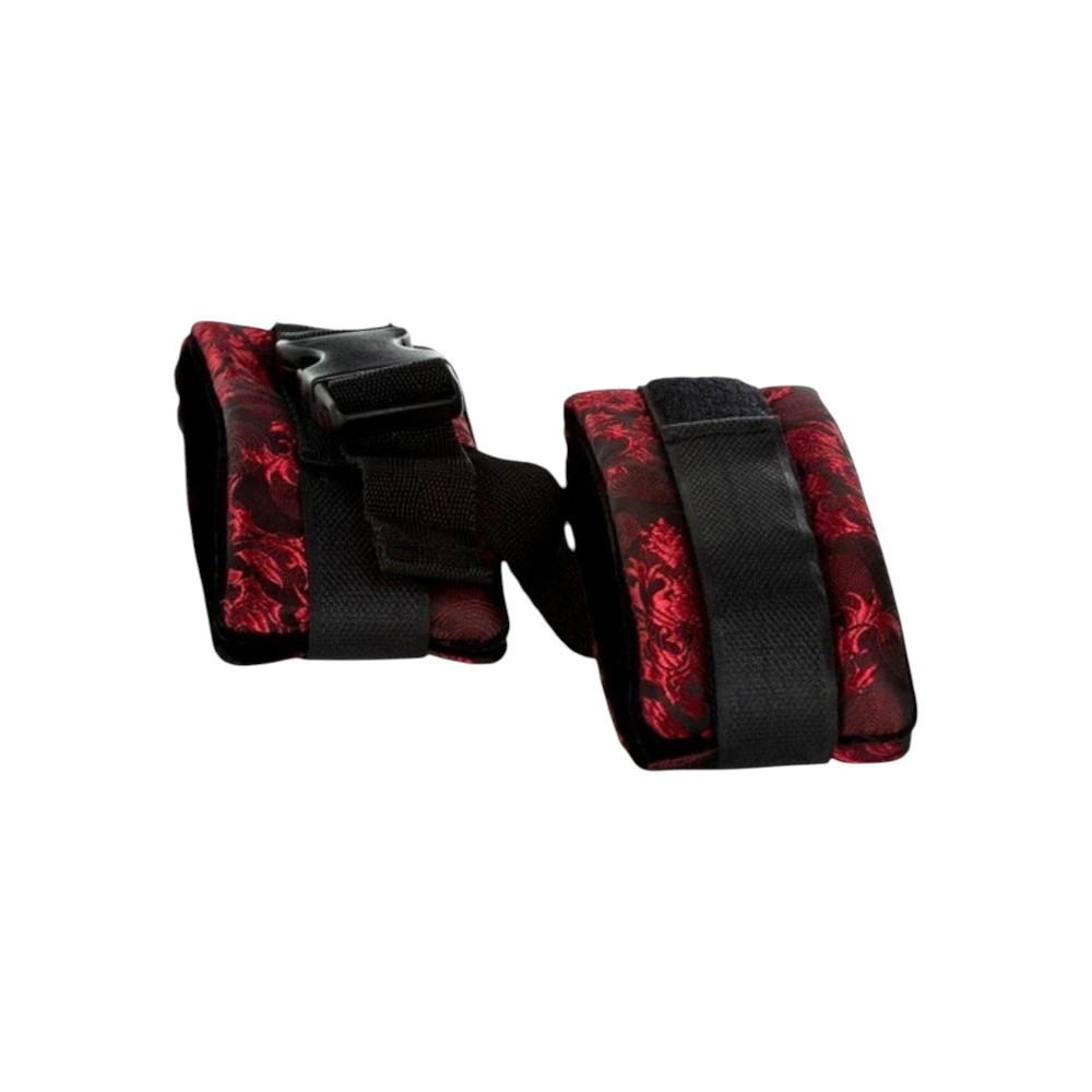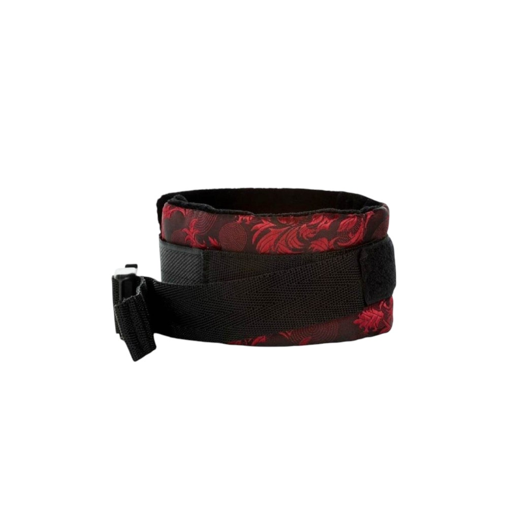 Stając się zależną/nym Dominującego/cej jesteście w stanie nawiązać dużo bardziej intymną więź przez budowanie obustronnego zaufania. Bransolety kajdanek wykończone są bogato zdobioną, czarno-czerwoną tkaniną o subtelnym połysku.