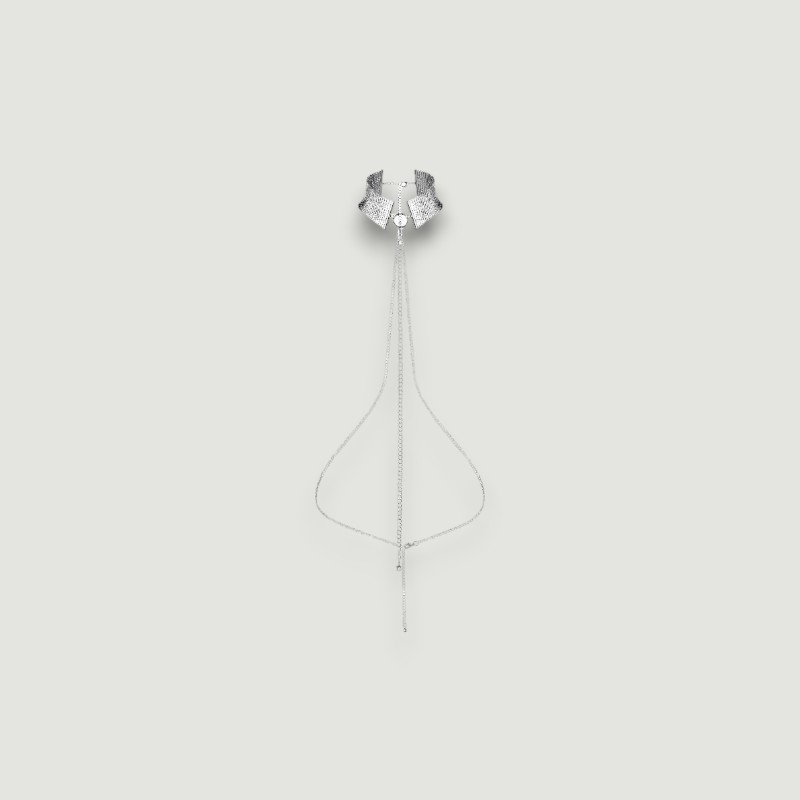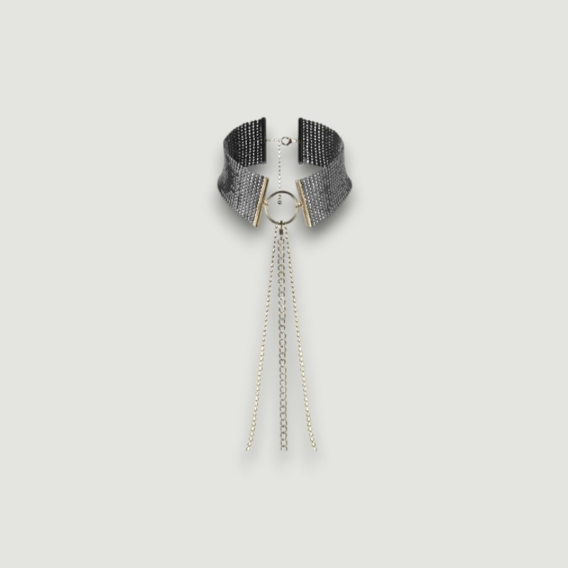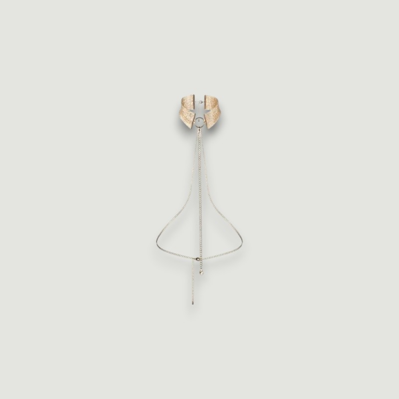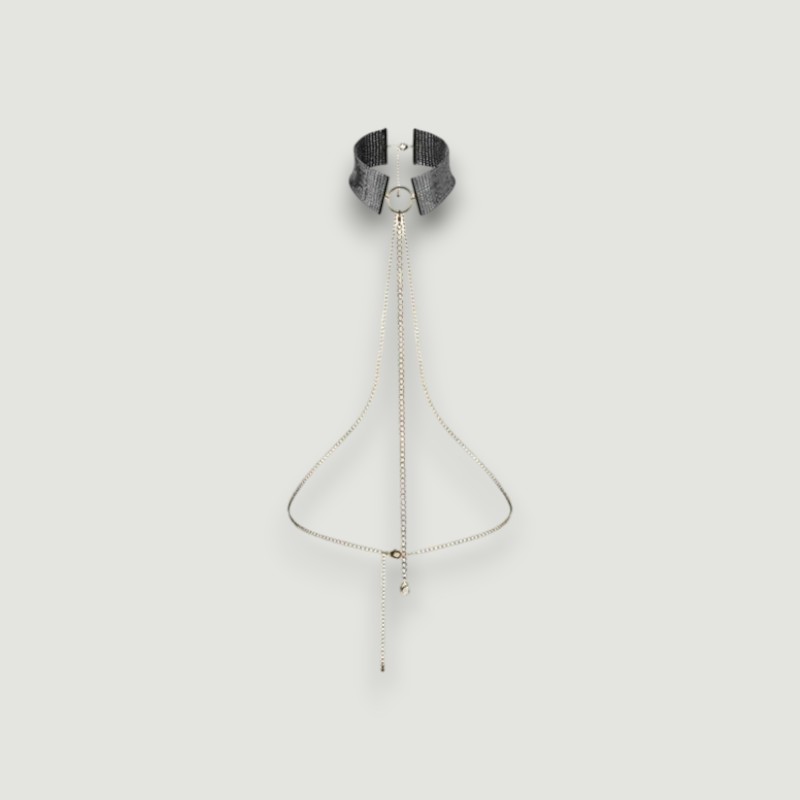 Obroża dopasowuje się do szyi, otulając ją chłodnym metalem, podczas gdy długi, oplatający tułów łańcuszek podkreśla linię ciała i dodaje zmysłowej oprawy każdemu ruchowi. Możesz nosić ją jako stylowy dodatek lub wykorzystać w intymnych chwilach, pozwalając partnerowi przejąć kontrolę.