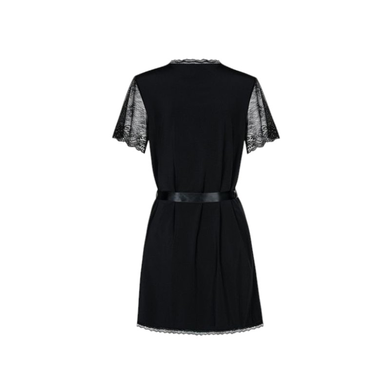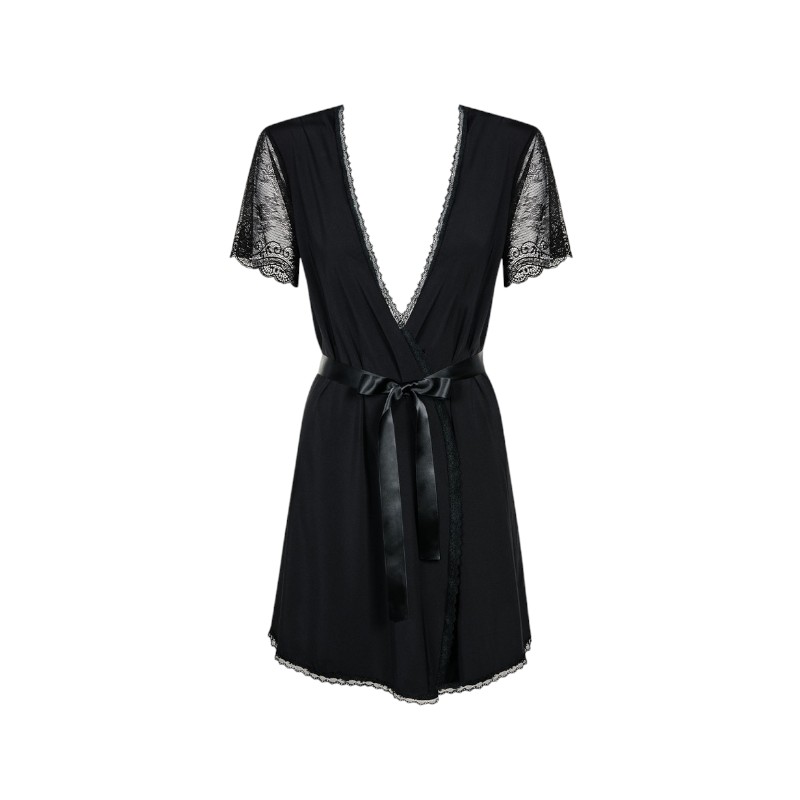 Elegancka bielizna o wysokiej jakości, wykonana z gładkiej, elastycznej tkaniny, która doskonale dopasowuje się do sylwetki. Szlafrok posiada zmysłowe koronkowe wykończenia na rękawach, dodające mu elegancji i subtelności. Miękka, przewiewna tkanina zapewnia komfort noszenia przez cały dzień, a satynowy pasek pozwala na regulację w talii, co umożliwia idealne dopasowanie. W zestawie znajdują się również pasujące, gładkie stringi.