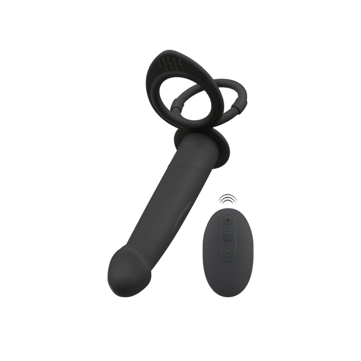 Podwójny dildo na pilota jest również wyposażony w (drugi) wibro-penis do podwójnego pchnięcia. Smukły, lekki wibrator analny jest mocno przymocowany do połączonego pierścienia na penisa i jądra. Pierścienie są po prostu nasuwane na penisa i jądra i utrzymują wibrator mocno i bezpiecznie na miejscu. Pierścienie wspierają również erekcję dzięki ciasnemu dopasowaniu.