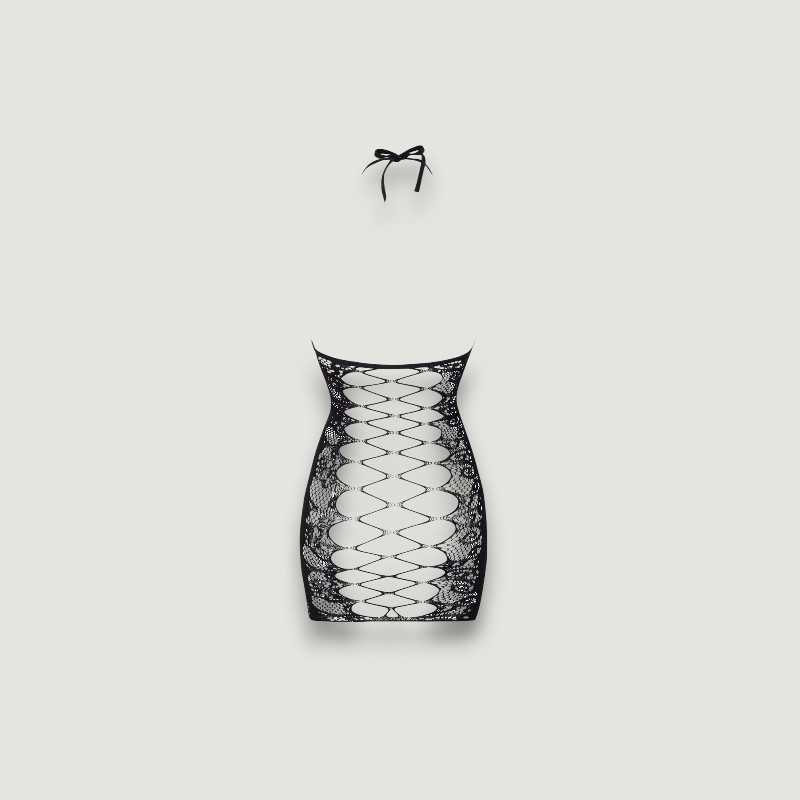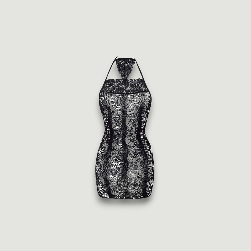 Koronkowa propozycja dla kobiet, które lubią łączyć elegancję z bezkompromisową zmysłowością. Sukienka typu bodystocking wykonana z miękkiej, elastycznej koronki idealnie dopasowuje się do ciała, subtelnie je opinając i podkreślając każdą linię. Przód zdobi ażurowy wzór tworzący efektowne prześwity, a dekolt otoczony koronkową lamówką przyciąga spojrzenia.