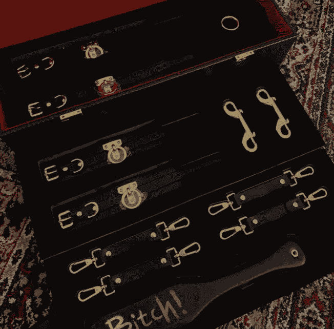 - Leather Handcuffs i Ankle Cuffs, to skórzane uprzęże na nadgarstki i kostki. Złota blaszka w kształcie litery T ozdobiona dużym pierścieniem stanowi niepowtarzalną ozdobę, która idealnie komponuje się z czarną skórą oraz umożliwia łączenie elementów, by utrudnić poruszanie się uległej lub wymusić pozycję jej ciała.
