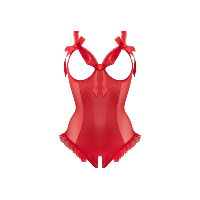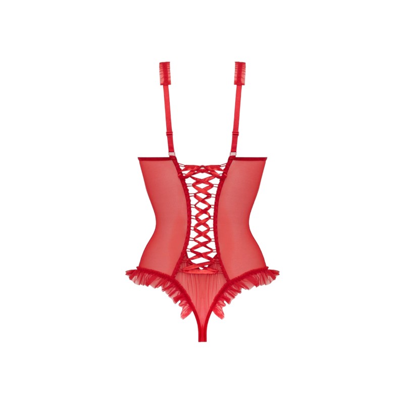 Otwarte miseczki z fiszbinami pięknie eksponują biust, dodając mu wsparcia i podkreślając jego kształt. Otwarty krok sprawia, że model jest nie tylko kuszący, ale i gotowy na każdą pikantną sytuację. Satynowe sznurowanie na plecach to z kolei detal, który dodaje całości wyjątkowego charakteru i pozwala na idealne dopasowanie do sylwetki.